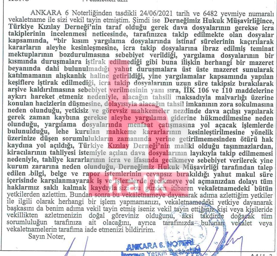 Fatma Meriç Yılmaz'ın avukatlara gönderdiği yazıda, "Derneğimiz Hukuk Müşavirliği tarafından talep edilen bilgi, belge ve rapor istemlerinin cevapsız bırakıldığı yahut makul süre içerisinde karşılanmayarak iş ve işlemlerde gecikmeye yol açmanızdan dolayı tüm haklarımız saklı kalmak kaydıyla sizi bugünden itibaren vekaletnamedeki bütün yetkilerden azlettim. Bundan sonra bu vekaletnameye dayanarak adıma azlettiğim yetkiler ile ilgili olarak herhangi bir işlem yapmamanızı, vekaletnamedeki yetkiye dayanarak başkasını da benim adıma vekil tayin etmiş iseniz vekil tayin ettiğiniz kişi veya kişilerde vekillikten azletmenizin doğal göreviniz olduğunu, aksi takdirde doğacak tüm sorumluluğun tarafınıza ait olacağını, ayrıca tarafınızda bulunan vekalet veya vėkaletnamelerin tarafıma iade etmenizi bildiririm" ifadeleri yer aldı.