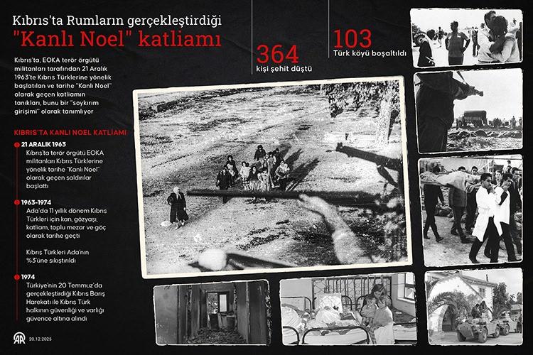 KANLI NOEL KATLİAMIKıbrıs'ta terör örgütü EOKA militanlarınca 21 Aralık 1963'te Kıbrıs Türklerine yönelik başlatılan ve tarihe "Kanlı Noel" olarak geçen katliamın 62. yılı.