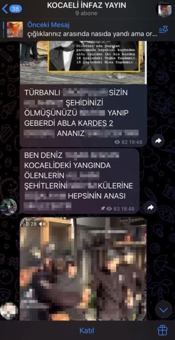 SKANDAL PAYLAŞIMLAR PES DEDİRTTİOlayın ardından, “Kocaeli İnfaz Yayın” adlı bir Telegram hesabında yangında hayatını kaybeden vatandaşlara yönelik küfür ve hakaret içeren paylaşımlar yapıldığı belirlendi.