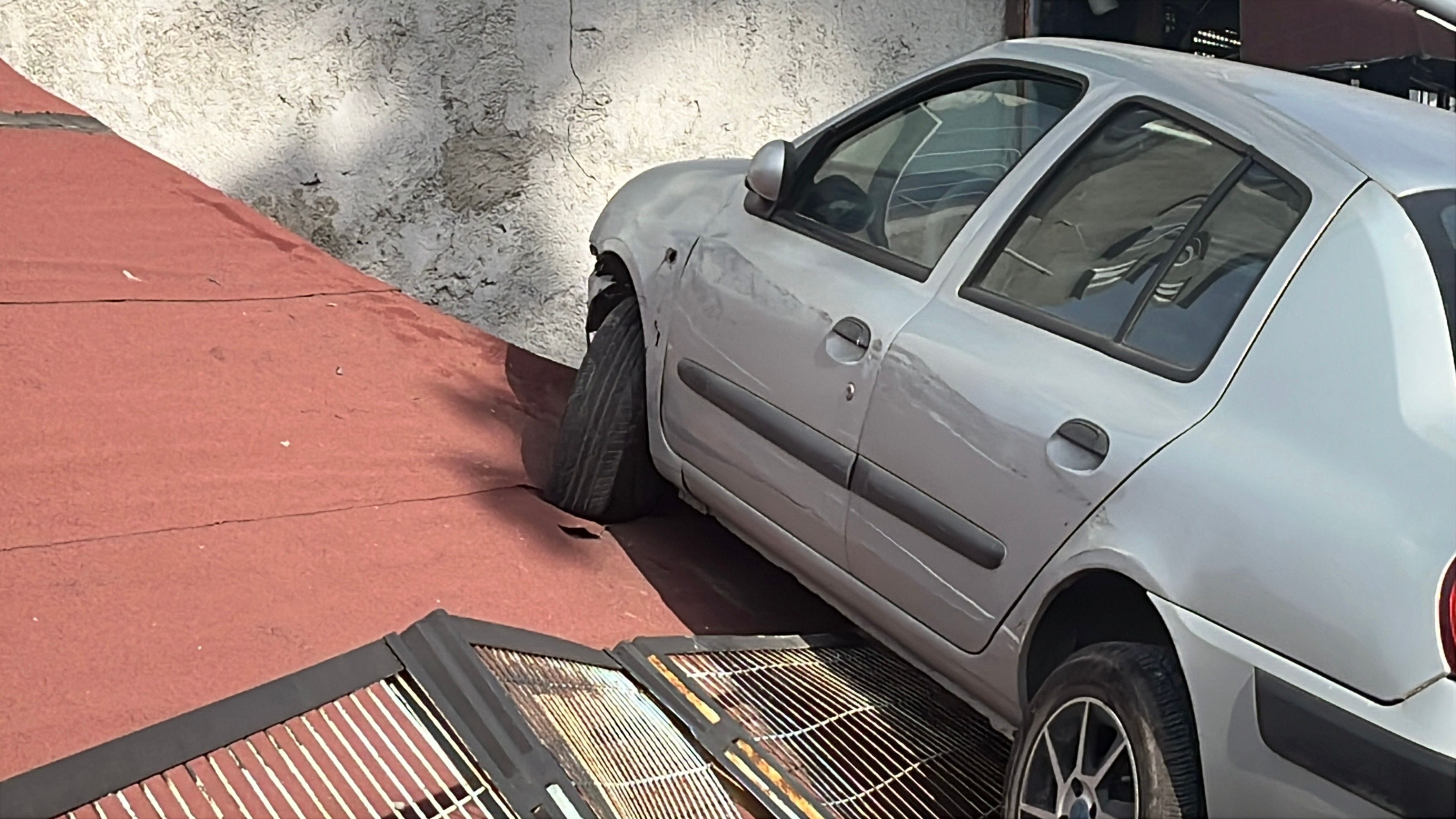EVİN ÇATISINA UÇTU!Kazanın şiddetiyle savrulan otomobil, kaldırımdaki korkulukları aşarak yol seviyesinin altında kalan tek katlı evin çatısına düştü.
