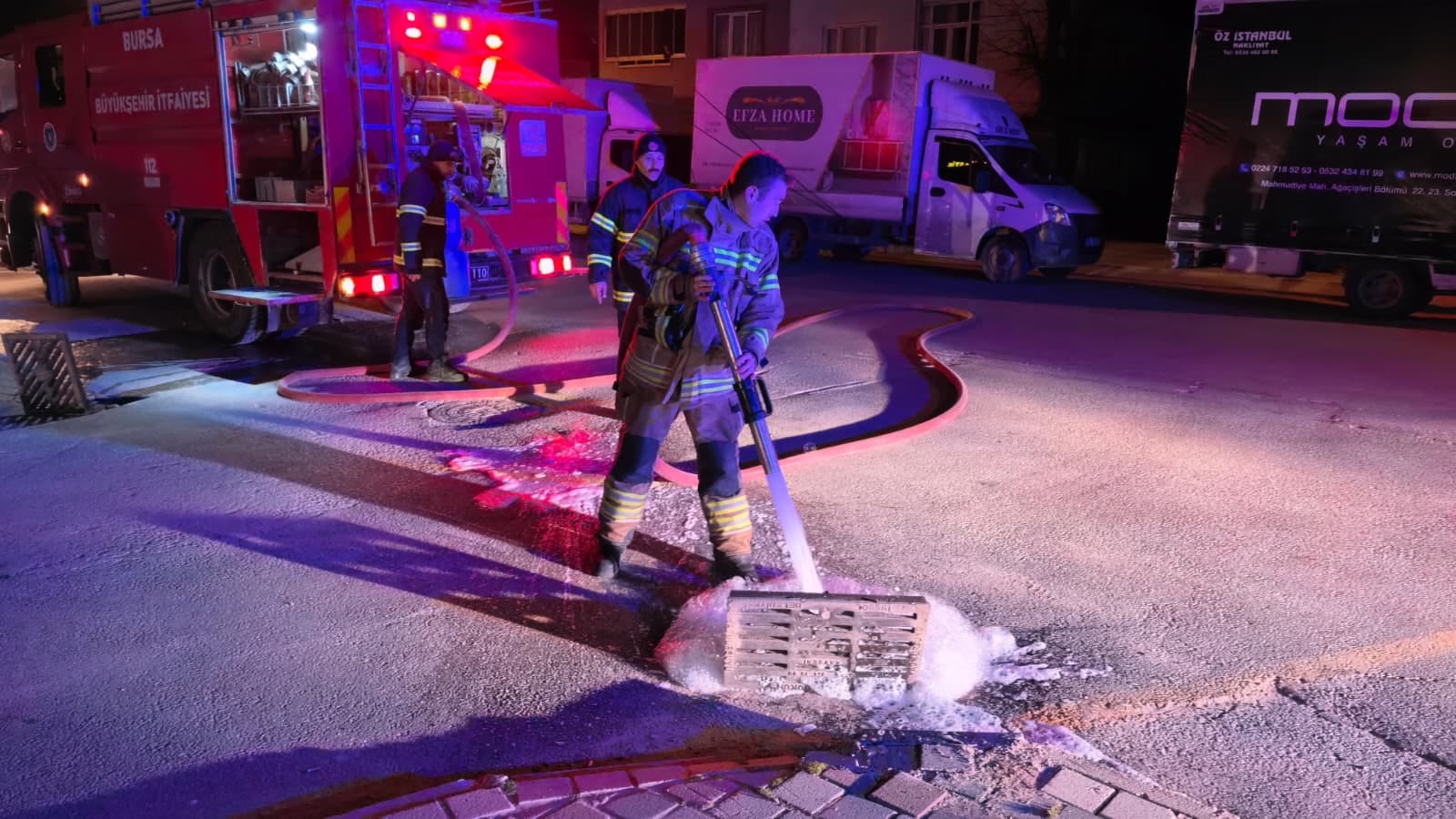 İtfaiye ekipleri, sokaklardaki altyapı giderlerine köpük sıkarak gazın etkisini azaltmak için çalışma yaptı.