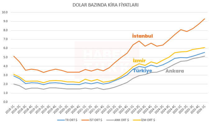 KİRALAR DOLAR BAZINDA SERT ARTTIKonut fiyatlarında dolar bazında zirveye doğru yolculuk sürerken kirada hem Türkiye ortalaması hem de 3 büyük şehir rekor üstüne rekor kırıyor.