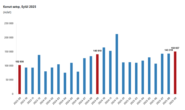 Türkiye genelinde konut satışları Eylül ayında bir önceki yılın aynı ayına göre yüzde 6,9 oranında artarak 150 bin 657 oldu. Konut satış sayısının en fazla olduğu iller sırasıyla 24 bin 119 ile İstanbul, 13 bin 417 ile Ankara ve 8 bin 544 ile İzmir olurken, en az olduğu iller sırasıyla 70 ile Ardahan, 117 ile Bayburt ve 142 ile Tunceli olarak gerçekleşti.