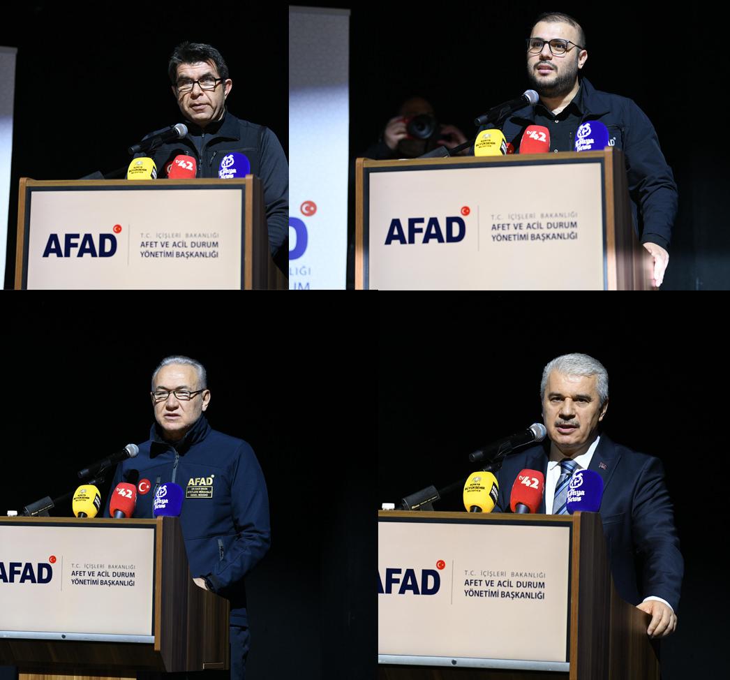 Selçuklu Kongre Merkezi’nde düzenlenen programda Konya İl Afet ve Acil Durum (AFAD) Müdürü Ali İhsan Körpeş ve AFAD Gönüllülük, Sivil Savunma ve Akreditasyon Daire Başkanı Hüseyin Ceven’in konuşmasının ardından söz alan AFAD Afetlere Müdahale Genel Müdürü Sadi Ergin, “Bu buluşma, hafızamızda hala taze, hala yüreğimizde acısı dinmeyen büyük bir gerçeğin, 6 Şubat’ın bizlere yüklediği tarihi sorumluluğun bir yansımasıdır. O zorlu günlerde bu ruhun en somut, güçlü ve en organize örneğini sergileyen illerimizden biri de şüphesiz Konya'mızdır. Burada başta Sayın Valimizin, Sayın Büyükşehir Belediye Başkanımızın ve ilçe belediye başkanlarımızın şahsında tüm Konyalı kardeşlerimize kurumum ve şahsım adına şükranlarımı sunuyorum” dedi.