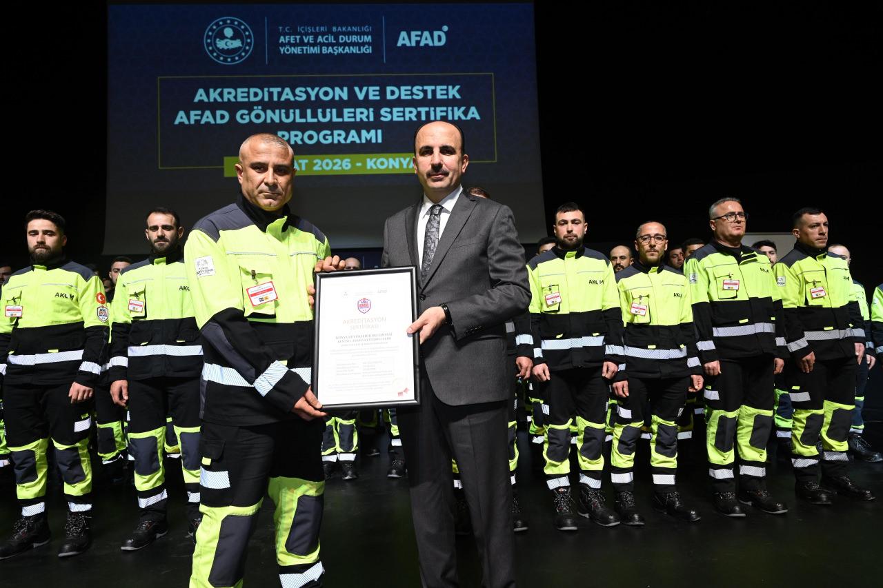 Konya Valisi İbrahim Akın ise, afetlere karşı hazırlıklı olmanın, olay anında hızlı, koordineli ve doğru müdahaleyi mümkün kılacak güçlü iş birliğini tesis etmenin hayati önem taşıdığını dile getirerek, “Bu doğrultuda Konya’mızda kentsel arama kurtarma ve afetlerde acil barınma faaliyetleri kapsamında oluşturulan, geçen yılla beraber 15 ekip, 621 kişiden oluşan ekiplerimiz, titiz bir çalışma ve eğitim sürecinin sonunda başarılı bir şekilde akredite edilmiştir. Tüm ekiplerimizin her türlü afet durumunda görev yapabilecek yüksek standartlara sahip yetkinlikte ve donanımda olduğunu özellikle vurgulamak istiyorum. Sertifika alan her bir gönüllümüzün afet anlarında toplumumuza karşı üstlendiği görevi aynı hassasiyet ve ciddiyetle sürdüreceğine yürekten inanıyor, başarılarının devamını diliyorum” dedi.