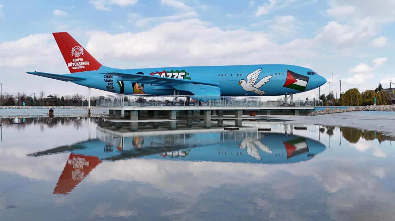 Konya Büyükşehir Belediyesi tarafından Ankara Yolu’ndaki Türk Yıldızları Parkı’nda sabit olarak bulunan, daha önce restoran olarak da kullanılan Airbus A300 tipi uçak, grafiti sanatıyla Gazze’ye destek veren bir esere dönüştürüldü.