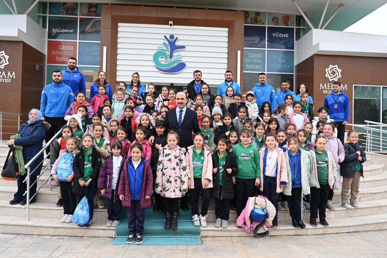 Konya Büyükşehir Belediye Başkanı Uğur İbrahim Altay, proje kapsamında Meram Belediyesi Berlika Spor Tesisi’nde yüzme eğitimi alan 3. sınıf öğrencilerini ziyaret etti.