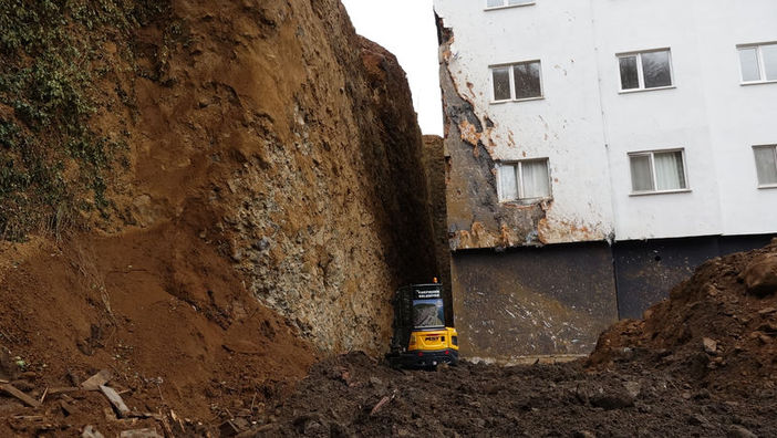 Trabzon'un Vakfıkebir ilçesinde meydana gelen, giriş katlarındaki evlerde bazı odaların kaya ve toprakla dolduğu heyelan sonrası tahliye edilip, mühürlenen 6 katlı apartmanda teknik incelemeler tamamlandı.