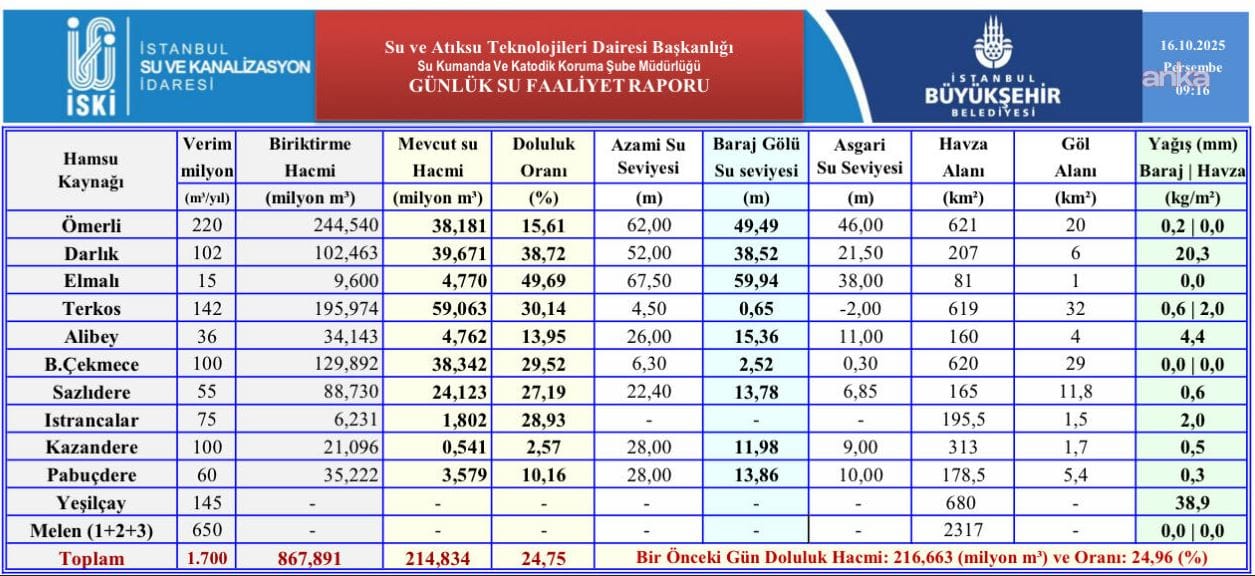 İSKİ verilerine göre, 16 Ekim 2025 itibarıyla İstanbul barajlarının genel doluluk oranı yüzde 24,75 olarak ölçüldü.
