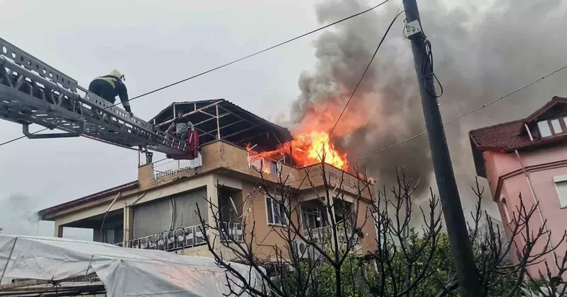 Yangın esnasında konutta mahsur kalan vatandaş kurtarılarak acil sağlık ekiplerine teslim edilirken, binanın çatısı, evin tüm odaları ve eşyaları tamamen yanarak zarar gördü.