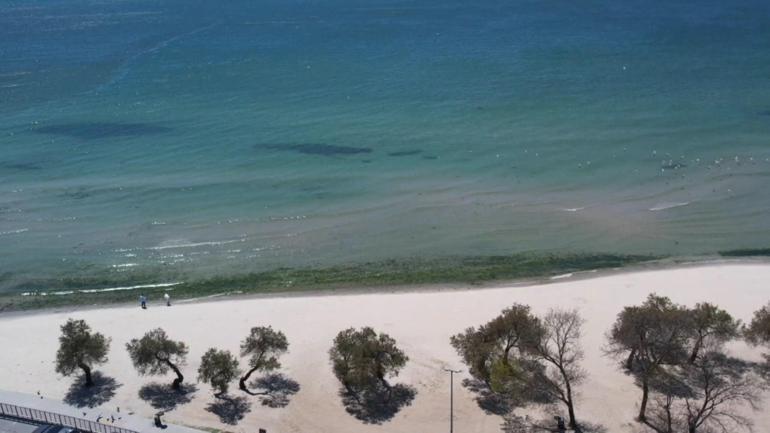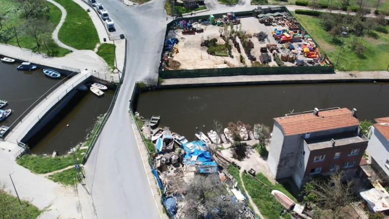 Küçükçekmece Gölü ile Marmara Denizi'ni birbirine bağlayan derede plastik ve gıda atıklarının bulunduğu, bazı teknelerin de batık halde olduğu görüldü. Rengi kahverengiye dönen derenin denizle buluştuğu alan, dron ile havadan görüntülendi.