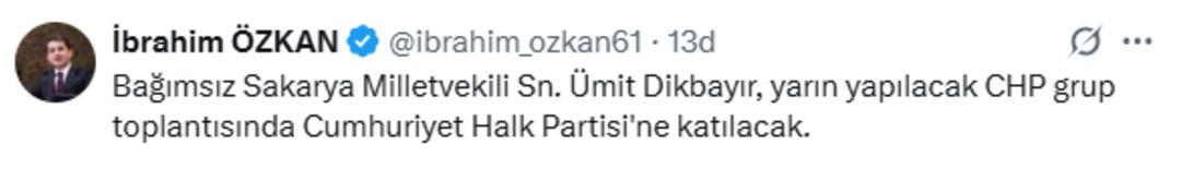 Haberi İBB Bağımsız Meclis üyesi İbrahim Özkan duyurdu. Özkan paylaşımında "Bağımsız Sakarya Milletvekili Sn. Ümit Dikbayır, yarın yapılacak CHP grup toplantısında Cumhuriyet Halk Partisi'ne katılacak." dedi.