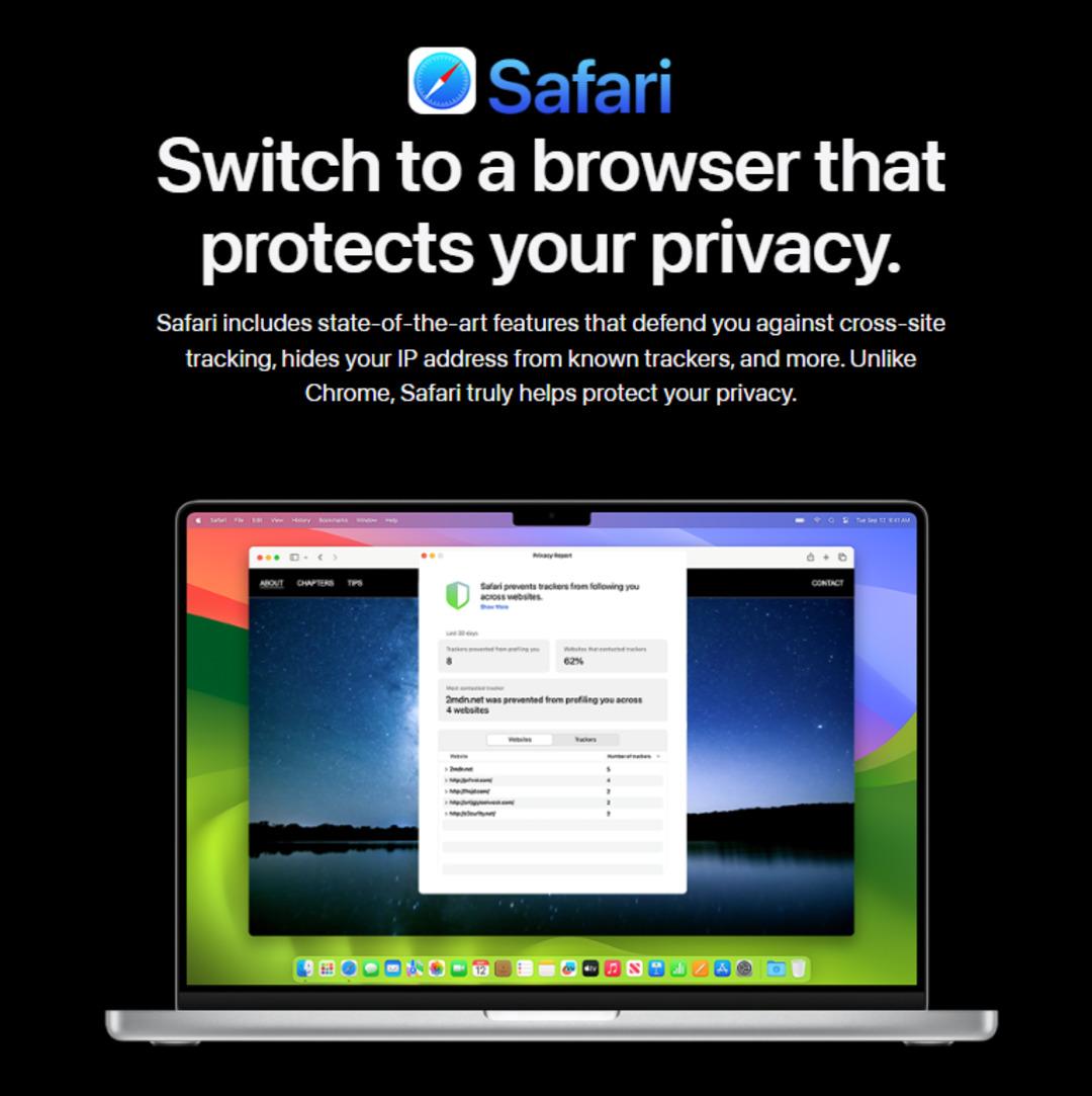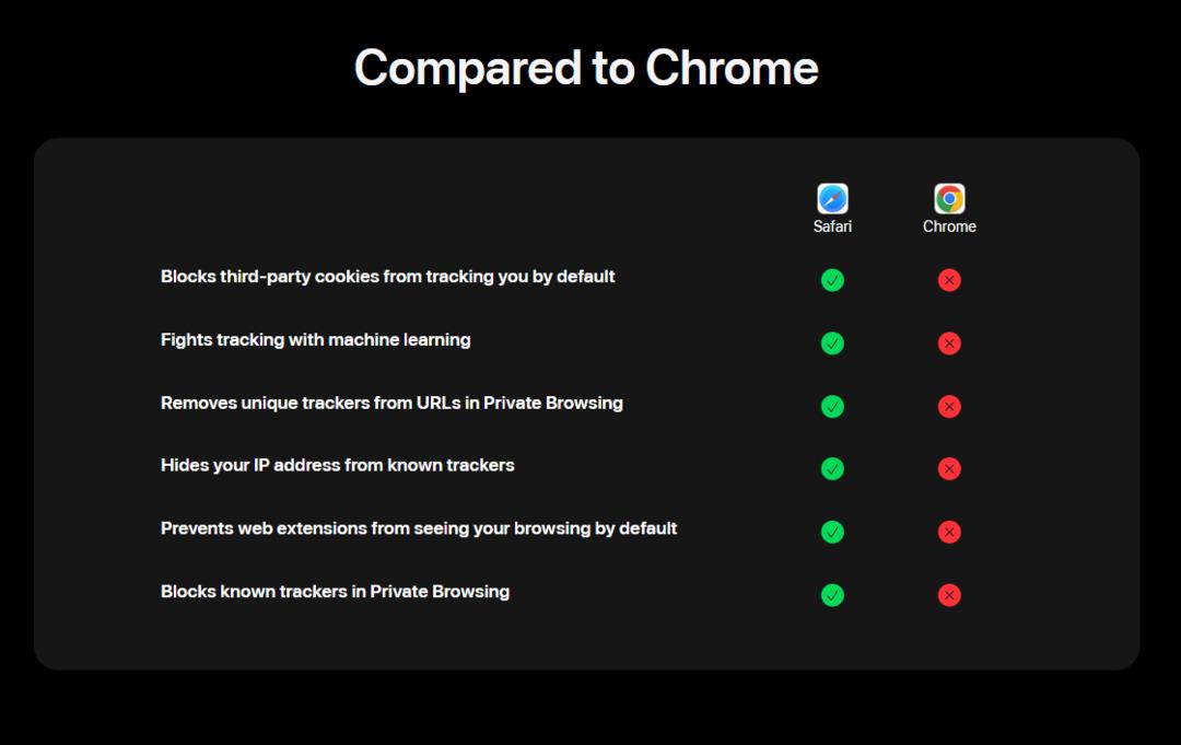 İnternet sitesindeki kapsamlı bir karşılaştırma listesinde Apple, Safari’de bulunup Chrome’da olmayan birçok özelliğe dikkat çekiyor. Bunlar arasında üçüncü taraf çerezleri engelleme, makine öğrenimiyle izleme önleme, Gizli modda URL’lerden benzersiz takip kodlarını kaldırma, ve web uzantılarından gezinme geçmişini gizleme gibi işlevler yer alıyor.