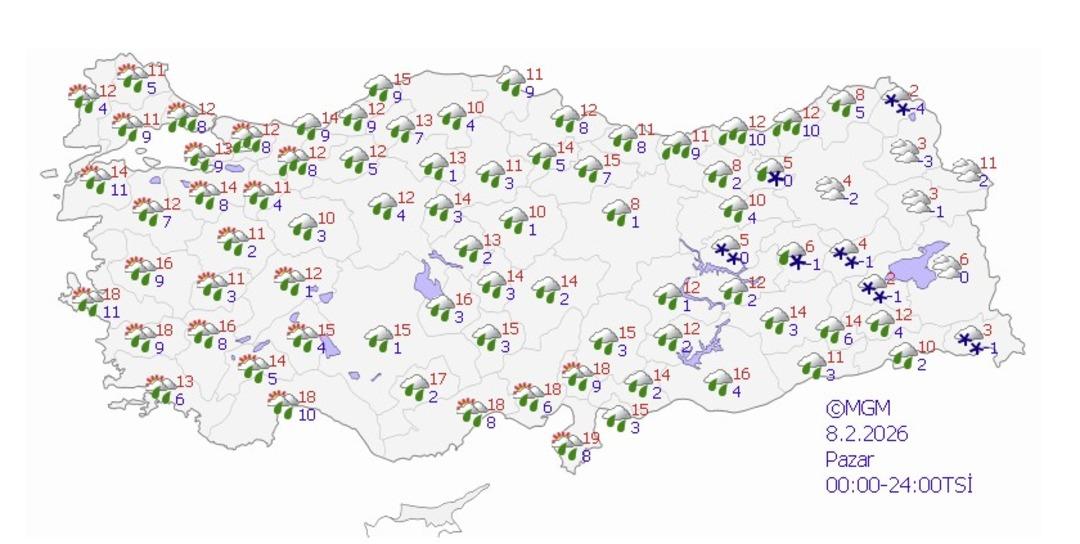 İstanbul 8/12 derece. Kırklareli 5/11 derece. Denizli 8/16 derece. İzmir 11/18 derece. Adana 6/18 derece. Ankara 4/12 derece. Samsun 8/12 derece. Erzurum -2/4 derece. Malatya 1/12 derece. Kars -3/3 derece. Diyarbakır 3/14 derece. Gaziantep 2/14 derece.