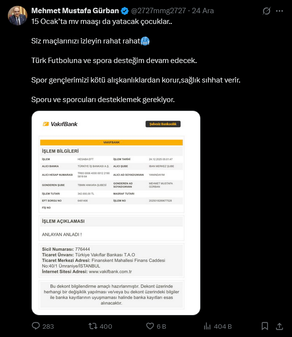 "ANLAYAN ANLADI"Gürban, daha önceki cezalarla birlikte toplam 342 bin TL’yi Bursaspor’un “Yanındayım” kampanyasına bağışladı. Banka dekontunu sosyal medya hesabından paylaştı. Açıklama kısmına ise sadece şu notu düştü: “Anlayan anladı.”