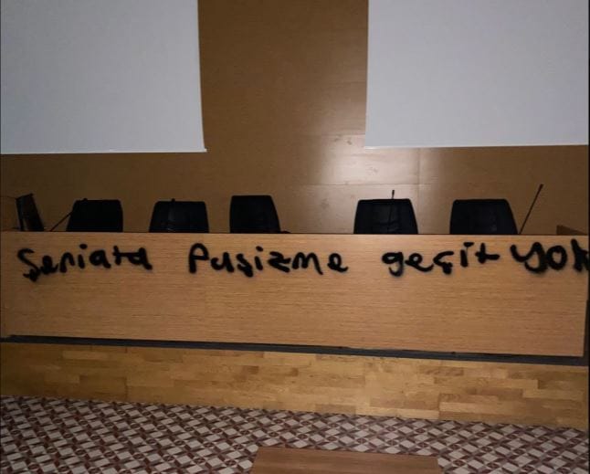 Etkinliğin düzenleneceği salona "Şeriata faşizme geçit yok" sloganı yazıldı.