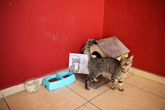 Arslanhan, veteriner kliniğine götürüp aşılarını yaptırdığı kedi için okul binasının girişine öğrencilerle barınak yerleştirdi.