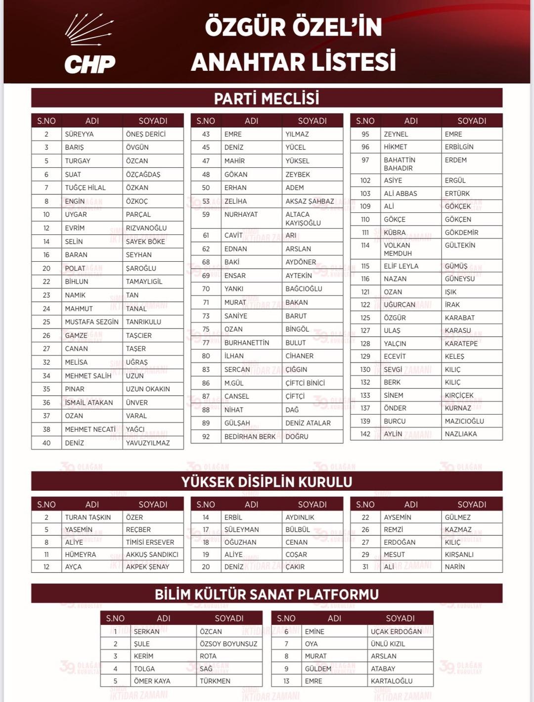 Parti Meclisi: Özel’in anahtar listesinde PM adayları arasında Süreyya Öneş Derici, Barış Övgün, Turgay Özcan, Suat Özçağdaş, Tuğçe Hilal Özkan, Engin Özkoç, Uygar Parçal, Evrim Rızvanoğlu, Selin Sayek Böke, Baran Seyhan, Polat Şaroğlu, Bihlun Tamaylıgil, Namık Tan, Mahmut Tanal, Mustafa Sezgin Tanrıkulu, Gamze Taşcier, Canan Taşer, Melisa Uğraş, Mehmet Salih Uzun, Pınar Uzun Okakın, İsmail Atakan Ünver, Ozan Varal, Mehmet Necati Yağcı, Deniz Yavuzyılmaz, Emre Yılmaz, Deniz Yücel, Mahir Yüksel, Gökan Zeybek, Erhan Adem, Zeliha Aksaz Şahbaz, Nurhayat Altaca Kayışoğlu, Cavit Arı, Ednan Arslan, Baki Aydöner, Ensar Aytekin, Yankı Bağcıoğlu, Murat Bakan, Saniye Barut, Ozan Bingöl, Burhanettin Bulut, İlhan Cihaner, Sercan Çıggın, M. Gül Çiftci Binici, Cansel Çiftçi, Nihat Dağ, Gülşah Deniz Atalar, Bedirhan Berk Doğru, Zeynel Emre, Hikmet Erbilgin, Bahattin Bahadır Erdem, Asiye Ergül, Ali Abbas Ertürk, Ali Gökçek, Gökçe Gökçen, Kübra Gökdemir, Volkan Memduh Gültekin, Elif Leyla Gümüş, Nazan Güneysu, Ozan Işık, Uğurcan Irak, Özgür Karabat, Ulaş Karasu, Yalçın Karatepe, Ecevit Keleş, Sevgi Kılıç, Berk Kılıç, Sinem Kırçiçek, Önder Kurnaz, Burcu Mazıcıoğlu ve Aylin Nazlıaka yer aldı.
