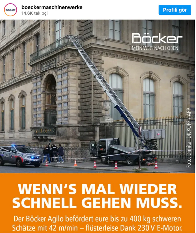 Paris’teki Louvre Müzesi’nde yaşanan değerli mücevherler hırsızlığı sonrası, soygunda kullanılan kaldırma cihazının üreticisi olan Alman Boecker Maschinenwerke, olayı mizahi bir şekilde kendi reklamına dönüştürdü.