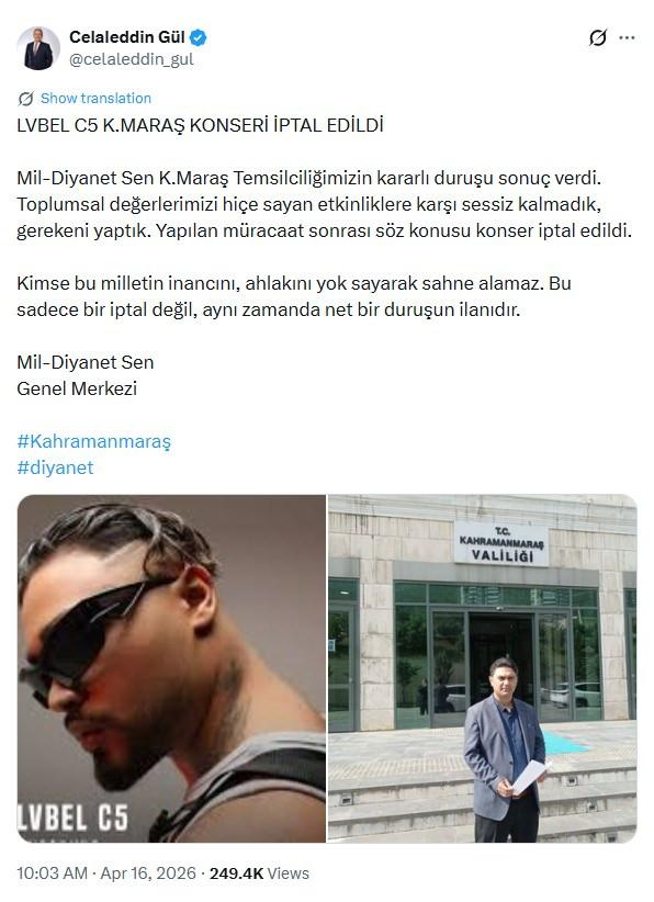 "LVBEL C5" sahne adlı Süleyman Burak Bodur'un 17 Nisan Cuma günü Kahramanmaraş Onikişubat ilçesinde vereceği konser, Manevi İlkeli Liyakatlı Diyanet ve Vakıf Çalışanları Sendikası'nın (Mil-Diyanet Sen) Kahramanmaraş İl Valiliği'ne başvurusuyla aynı gün içinde iptal edildi.