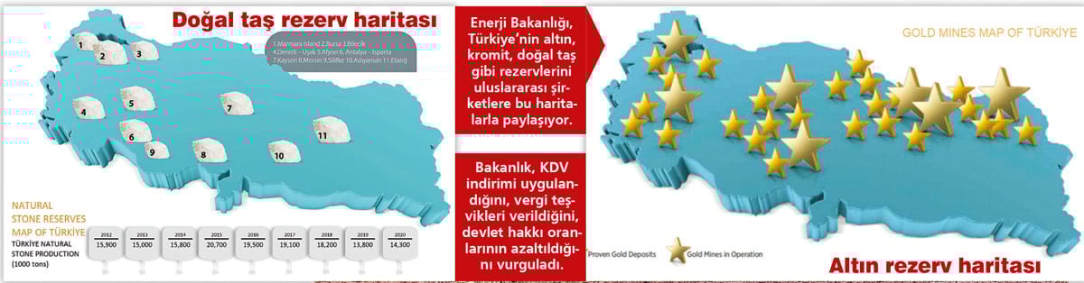 ‘Yerli ve milli’ söylemini altını doldurmadan sürekli tekrarlayan iktidar, ülkenin yer altı kaynaklarını yabancılara pazarlamaktan asla geri durmuyor. Enerji ve Tabii Kaynaklar Bakanlığı, kendi internet sitesinde İngilizce paylaştığı bir katologla Türkiye’nin madenlerini uluslararası şirketlere “Kârınızı maksimum seviyeye çıkarabilirsiniz” ifadesiyle tanıtıyor.