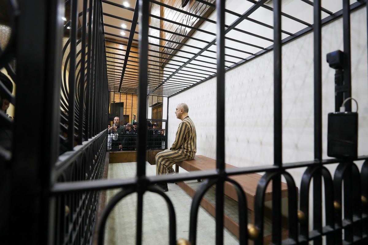 Televizyonlardan canlı yayınlanan duruşmada Necib'in, mahkeme salonunda demir korkuluklar ardındaki özel bir bölümde tutulduğu görüldü.