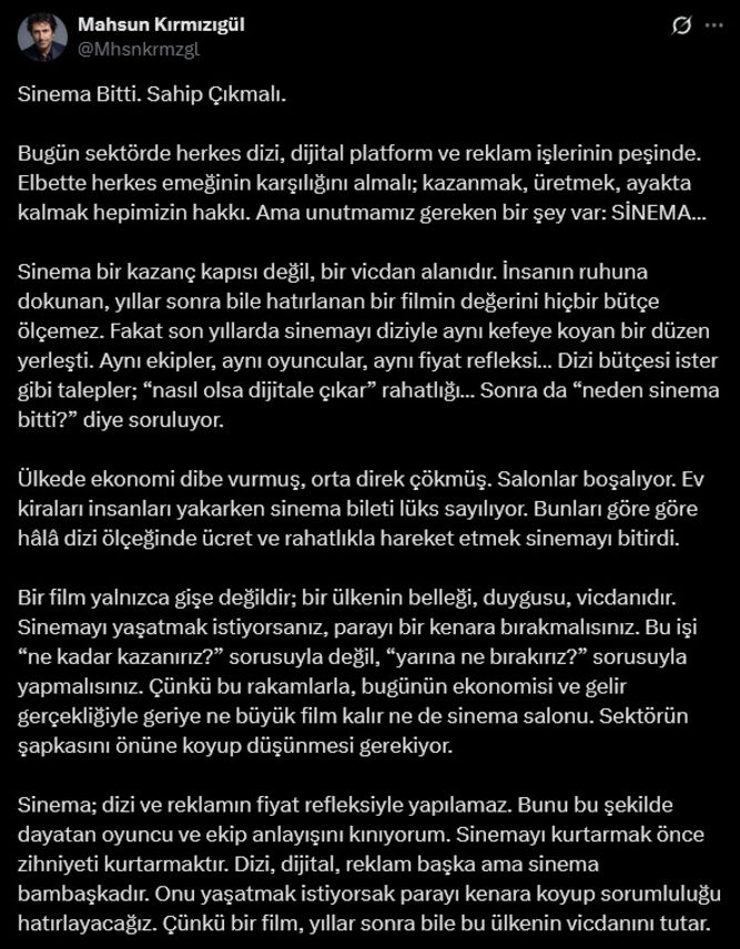 Mahsun Kırmızıgül, koronavirüs pandemisinin ardından, dijital platformların da artmasıyla zor günler yaşayan sinema sektöründe yaşanan krizle ilgili açıklamada bulundu. Müzisyenliğinin yanı sıra oyuncu ve yönetmen kimliği de olan Mahsun Kırmızıgül, X hesabından fikirlerini dile getirdi.