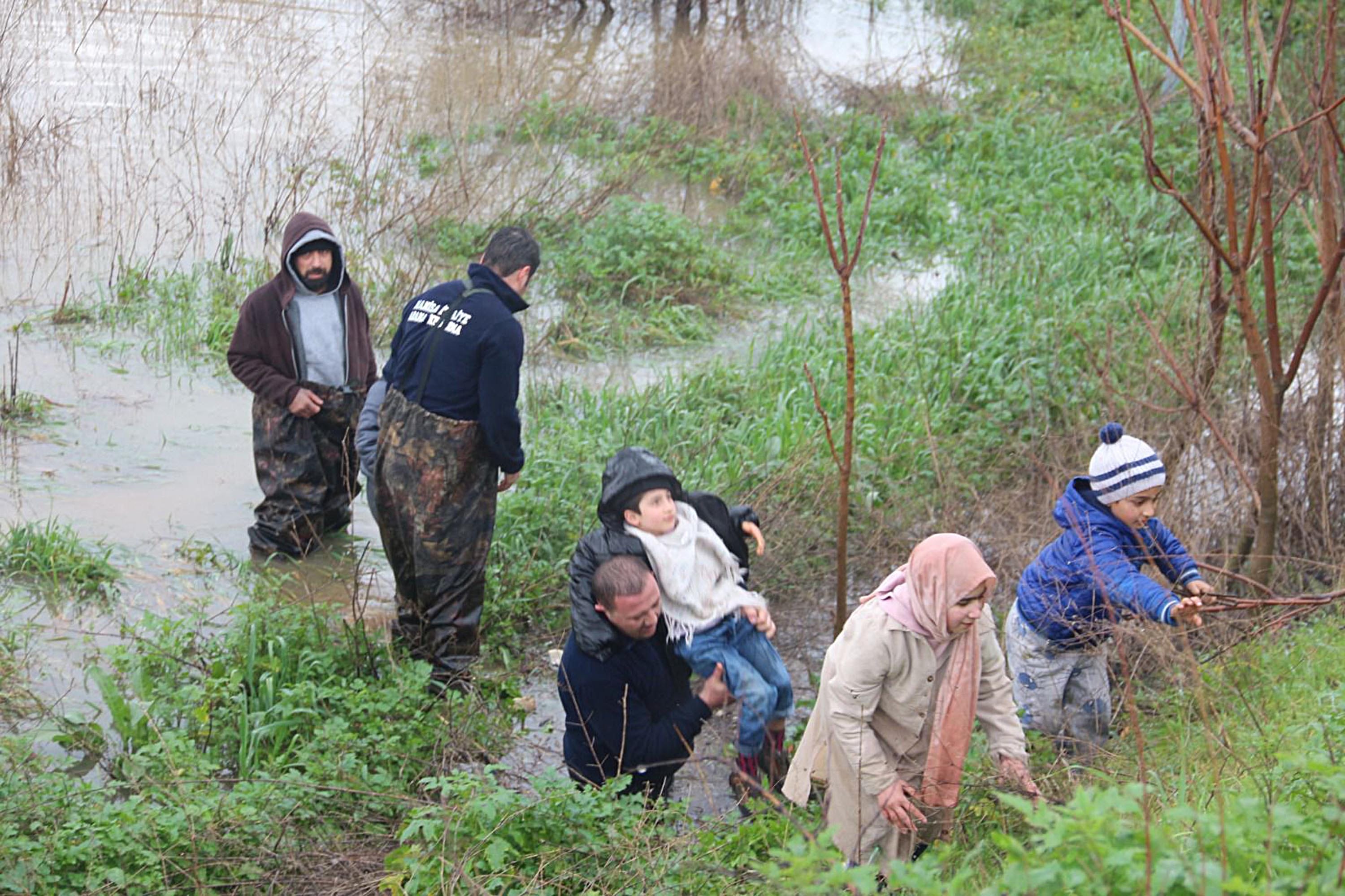 İtfaiye personeli, baba ile 4 çocuğunu güvenli bölgeye taşımak için seferber oldu. Ekipler, yaklaşık 1 kilometre mesafedeki su birikintilerini aşarak çocukları sırtlarında taşıyarak tahliye etti.