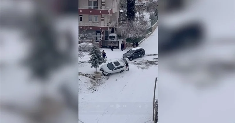 Tecde Mahallesi'nde ara sokakta bulunan dik yoldan aşağı inerken buzlanma nedeniyle kayan otomobil, yol kenarında park halinde bulunan bir otomobile çarptı.