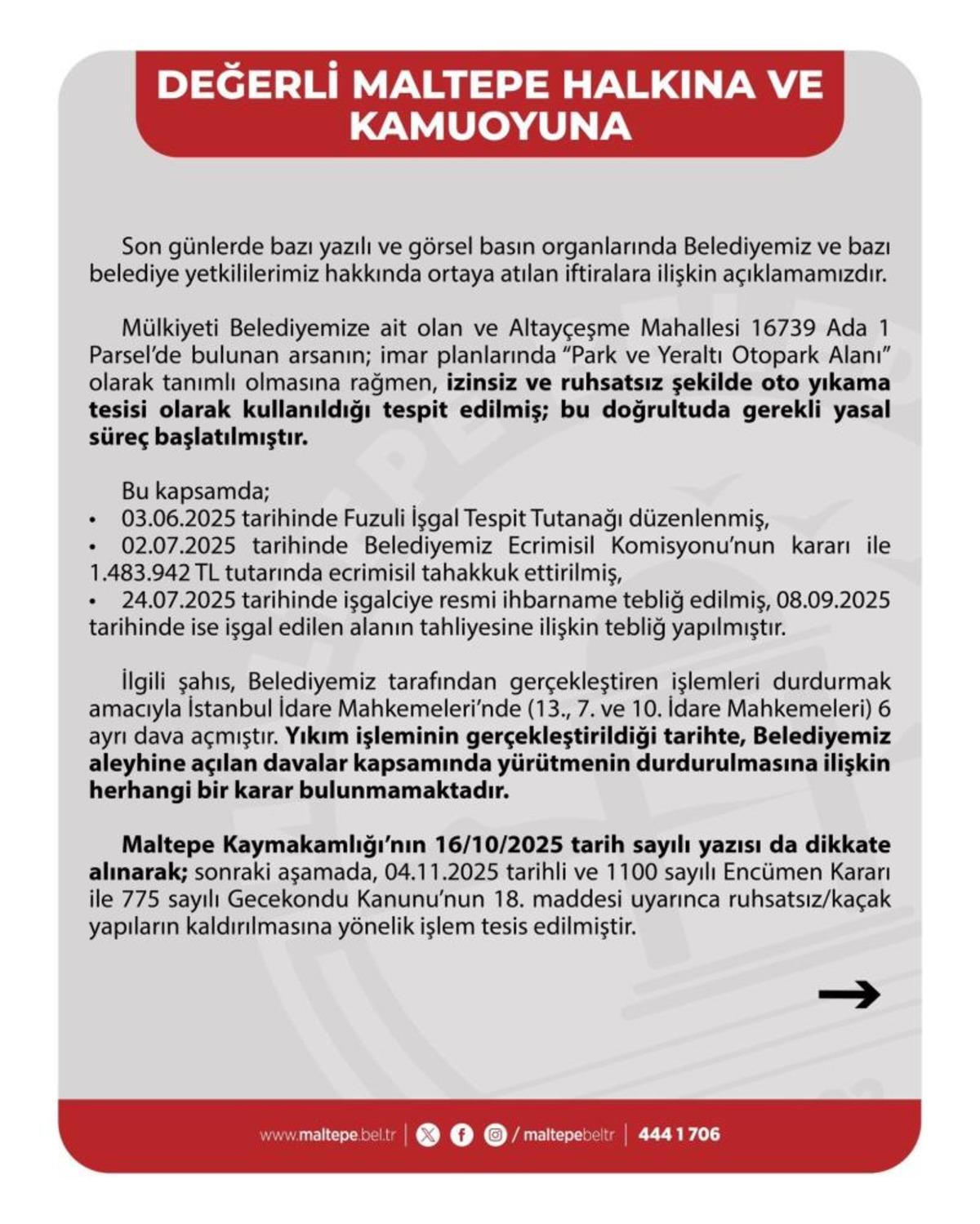 MALTEPE BELEDİYESİ İZİNSİZ ARSA KULLANIMIYLA İLGİLİ AÇIKLAMA"3 Haziran 2025 tarihinde bahsi geçen arsayla ilgili ‘Fuzuli İşgal Tespit Tutanağı’ düzenlenmiş, 2 Temmuz 2025 tarihinde Belediyemiz Ecrimisil Komisyonu’nun kararı ile 1.483.942 TL tutarında ecrimisil tahakkuk ettirilmiş, 24 Temmuz 2025 tarihinde işgalciye resmi ihbarname tebliğ edilmiş ve 8 Eylül 2025 tarihinde ise işgal edilen alanın tahliyesine ilişkin tebliğ yapılmıştır.