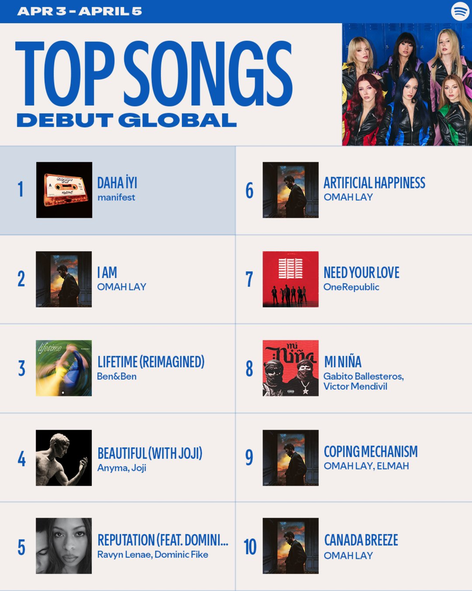 3-5 Nisan tarihlerini kapsayan listede; OneRepublic, Joji, Anpma ve Omah Lay gibi uluslararası yıldızları geride bırakan grup, listenin zirvesine yerleşti.
