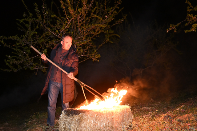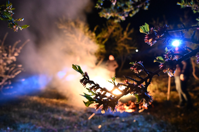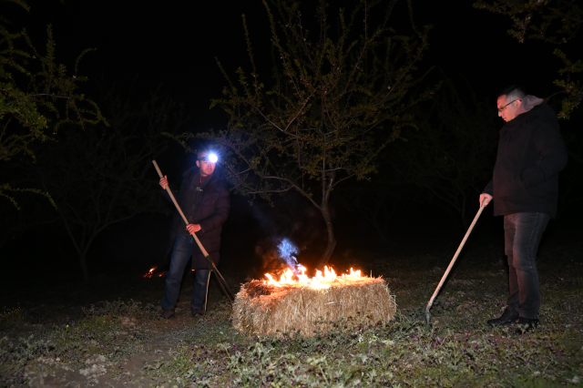 Gece saatlerinde sıcaklığın eksi 3 dereceye kadar düştüğü bölgede üreticiler, yaktıkları materyallerden çıkan yoğun duman sayesinde bahçe içerisindeki sıcaklığı sıfır derece civarında tutarak filizlerin donmasını önlemeye çalışıyor.