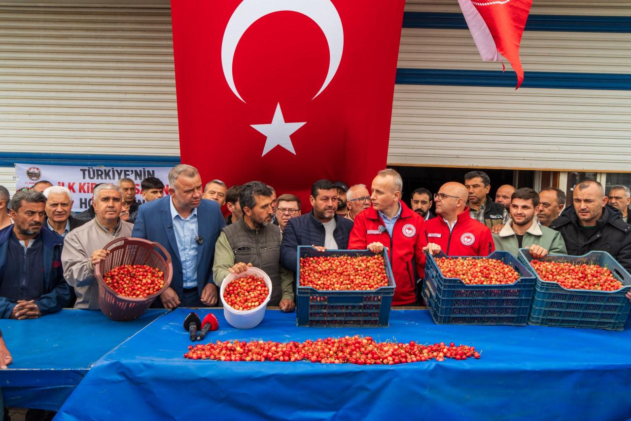 Manisa'nın Şehzadeler ilçesinde kuzey yarımkürenin hasat edilen ilk kirazı pazara getirildi. Yapılan açık arttırmayla kirazların kilogramı 6 bin TL'den satıldı.