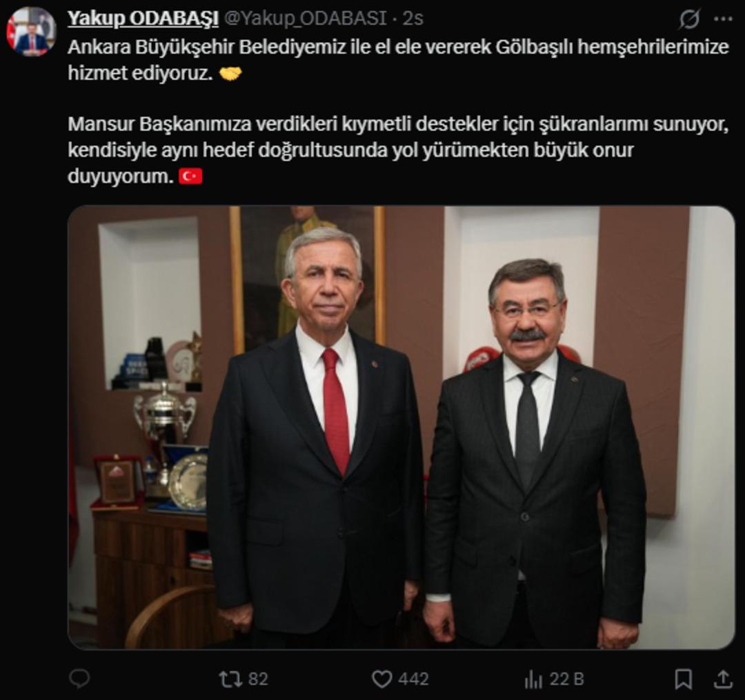 Gölbaşı Belediye Başkanı Yakup Odabaşı: Ankara Büyükşehir Belediyemiz ile el ele vererek Gölbaşılı hemşehrilerimize hizmet ediyoruz. Mansur Başkanımıza verdikleri kıymetli destekler için şükranlarımı sunuyor, kendisiyle aynı hedef doğrultusunda yol yürümekten büyük onur duyuyorum.