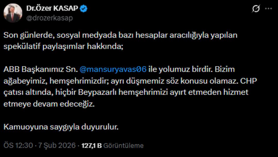 Beypazarı Belediye Başkanı Özer Kasap: Son günlerde, sosyal medyada bazı hesaplar aracılığıyla yapılan spekülatif paylaşımlar hakkında;ABB Başkanımız Sayın Mansur Yavaş ile yolumuz birdir. Bizim ağabeyimiz, hemşehrimizdir; ayrı düşmemiz söz konusu olamaz. CHP çatısı altında, hiçbir Beypazarlı hemşehrimizi ayırt etmeden hizmet etmeye devam edeceğiz.