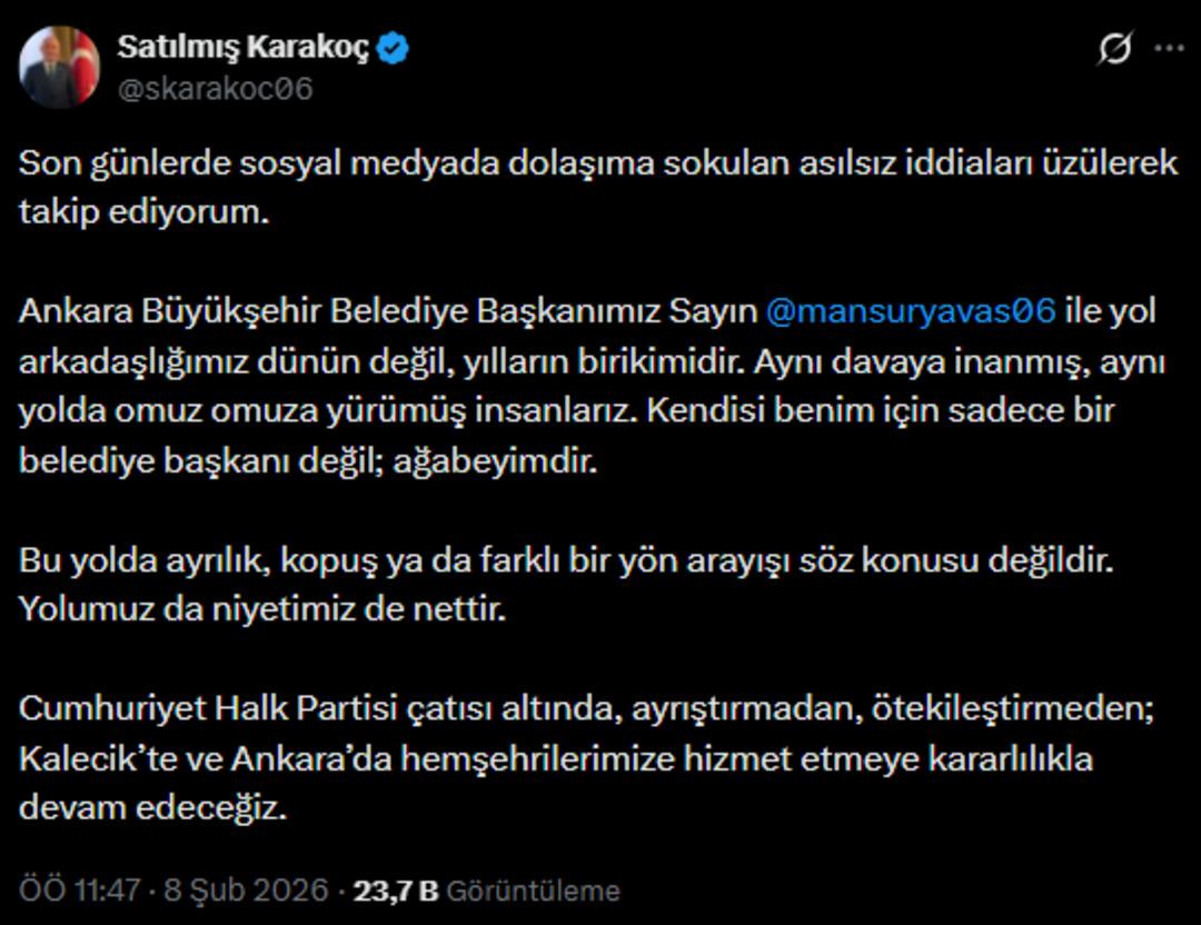 Kalecik Belediye Başkanı Satılmış Karakoç: Son günlerde sosyal medyada dolaşıma sokulan asılsız iddiaları üzülerek takip ediyorum.Ankara Büyükşehir Belediye Başkanımız Sayın Mansur Yavaş ile yol arkadaşlığımız dünün değil, yılların birikimidir. Aynı davaya inanmış, aynı yolda omuz omuza yürümüş insanlarız. Kendisi benim için sadece bir belediye başkanı değil; ağabeyimdir. Bu yolda ayrılık, kopuş ya da farklı bir yön arayışı söz konusu değildir. Yolumuz da niyetimiz de nettir. Cumhuriyet Halk Partisi çatısı altında, ayrıştırmadan, ötekileştirmeden; Kalecik’te ve Ankara’da hemşehrilerimize hizmet etmeye kararlılıkla devam edeceğiz.