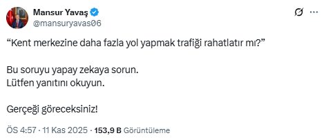 Kent merkezine daha fazla yol yapmak trafiği rahatlatır mı?" sorusunun yapay zekaya sorulması çağrısında bulunan Yavaş, "Lütfen yanıtını okuyun. Gerçeği göreceksiniz!
