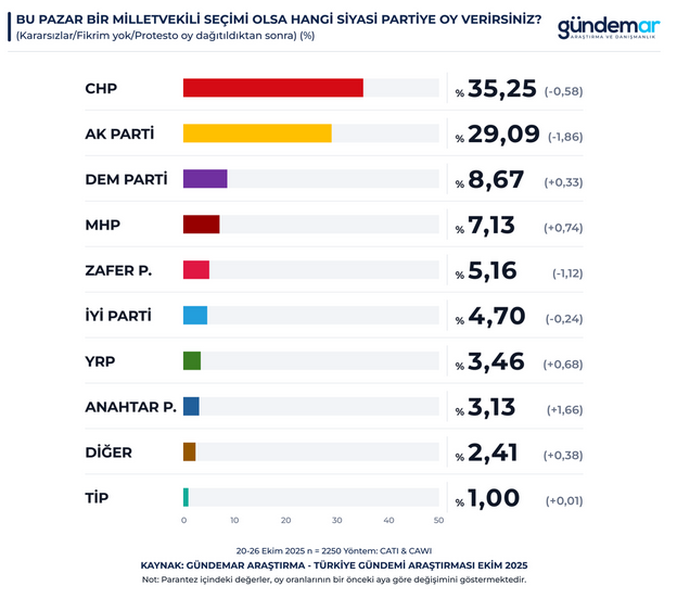 Araştırma, 20–26 Ekim 2025 tarihleri arasında 2.250 kişiyle yapıldı. Kararsızlar, protesto oylar ve fikrim yok diyenler oransal olarak dağıtıldıktan sonra partilerin oy oranları şu şekilde sıralandı: