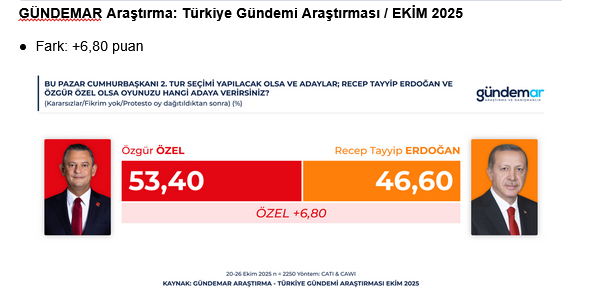 GÜNDEMAR Araştırma’nın Ekim 2025 tarihli “Türkiye Gündemi Araştırması”na göre, Cumhurbaşkanlığı seçiminde Ekrem İmamoğlu, Mansur Yavaş ve Özgür Özel, Recep Tayyip Erdoğan’a karşı avantajlı konumda görünüyor. Yavaş, Erdoğan'a en büyük farkı atan kişi oldu.