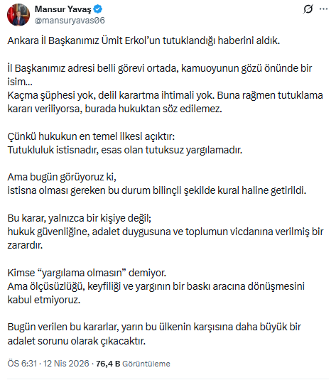 Ankara Büyükşehir Belediye (ABB) Başkanı Mansur Yavaş, CHP Ankara İl Başkanı Ümit Erkol'un tutuklanmasına sosyal medya X hesabından tepki gösterdi.