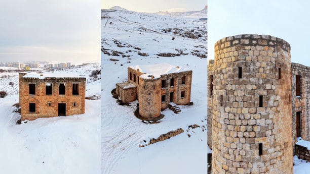 Mardin de beyaza bürünen tarihi karakol, havadan görüntülendi