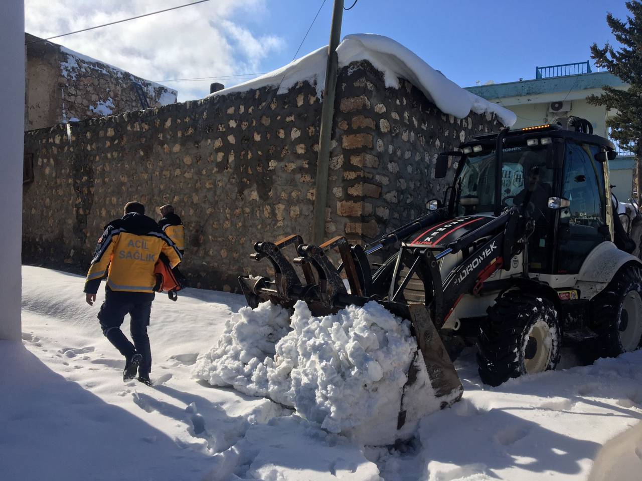HASTA, KEPÇE İLE AMBULANSA TAŞINDIEkipler, karla kaplı yolu iş makineleriyle açmaya çalıştı. Ambulansın ilerleyememesi üzerine ekipler, hastayı kepçeyle evinden alıp, ambulansa taşıdı.