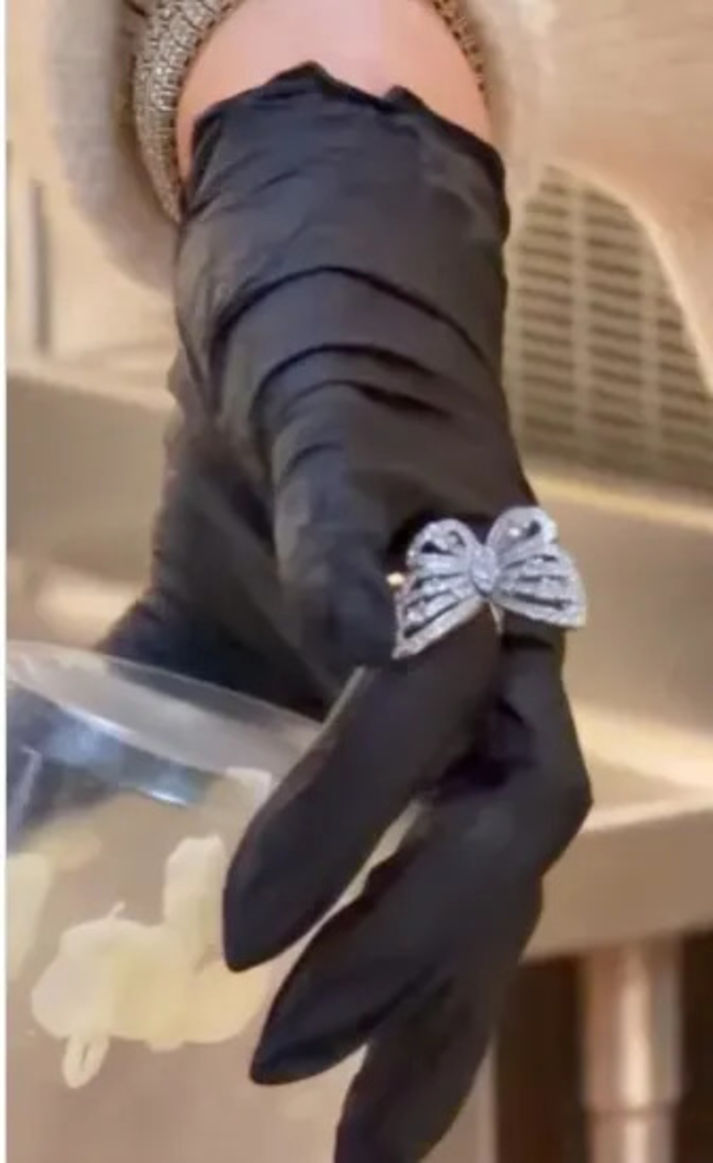 Mariah Carey'in kelebek yüzüğü yiyeceklerin arasında parıldıyordu. Carey'in ışıltılı yüzüğü bir çift siyah lateks eldivenin üzerinde duruyordu. Ünlü şarkıcı; "Evet, eldiven takıyorum. Tamam mı? İşte bunu seviyorum" dedi.