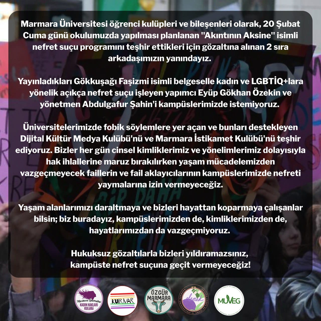 TRT’nin dijital platformu Tabii’de yayınlanan belgeselin gösterimi öncesinde fakültede geniş güvenlik önlemleri alındı. Salona giren bir öğrenci, belgeselin içeriğine ve ismine atıfta bulunarak, "Sizler burada nefret suçu için toplanıyorsunuz" diyerek protesto başlattı. Katledilen Marmara Üniversitesi öğrencisi Ahmet Yıldız, Hande Kader ve Eylül Cansın’ı hatırlatan öğrenci, LGBTİQ+ kimliklerin hedef gösterilmesine tepki gösterdi.