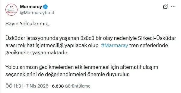İstanbul’da hizmet veren Marmaray hattında aksama yaşanıyor. Yapılan resmi açıklamada, Üsküdar İstasyonu’nda meydana gelen üzücü bir olay nedeniyle Sirkeci-Üsküdar arasında tren seferlerinin tek hat üzerinden gerçekleştirildiği bildirildi.