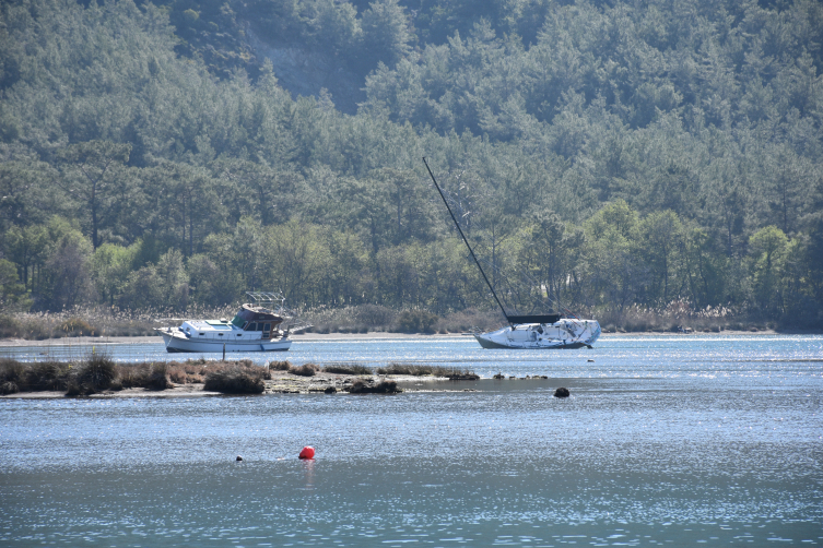 Adaköy Mahallesi Yalancıboğaz mevkisinde deniz suyunun çekilmesiyle kum adacığı oluştu, bölgede bulunan tekneler, salmalarının karaya oturması nedeniyle yan yattı.