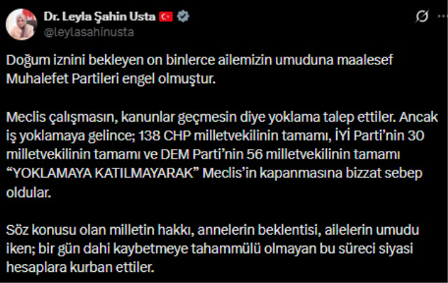 LEYLA ŞAHİN USTA: MUHALEFET PARTİLERİ ENGEL OLDUAK Parti Grup Başkan Vekili ve Ankara Milletvekili Leyla Şahin Usta, "Doğum iznini bekleyen on binlerce ailemizin umuduna maalesef Muhalefet Partileri engel olmuştur.