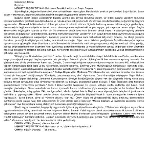 T24'ten Ceren Bayar'ın haberine göre İçişleri Bakanı Ali Yerlikaya’nın bütçe sunumunun ardından söz alan DEM Parti milletvekilleri Dilan Kunt Ayan ve Mehmet Rüştü Tiryaki, konuşmalarında bazı ifadeleri Kürtçe dile getirdi.