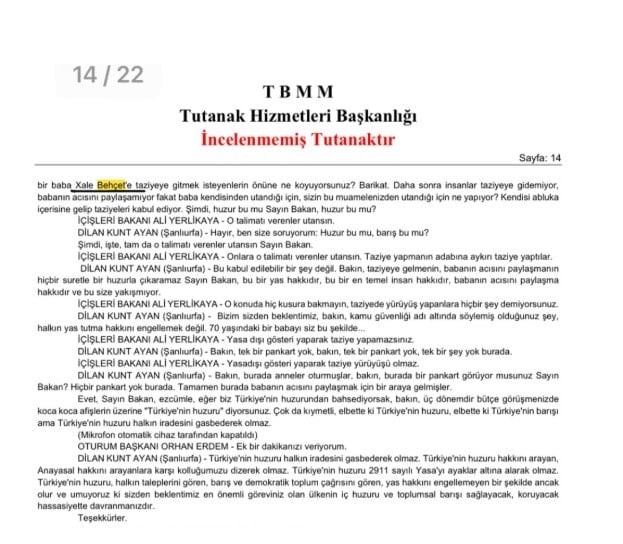 Dilan Kunt Ayan’ın konuşmasında kullandığı “Jin, Jiyan, Azadî” (Kadın, Hayat, Özgürlük) sloganı ise tutanaklara “…” şeklinde yansıdı.