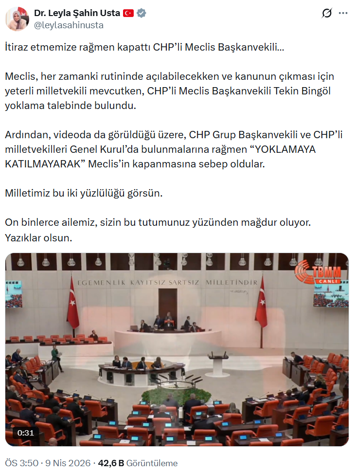 Çoğunluk olmadığı için genel kurul kapandı, son dönemde sıkça olduğu gibi. Grup Başkanvekilimiz Leyla Şahin Usta, yoklama isteyen ve oturuma katılmayan muhalefeti suçladı: